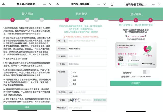 公开报道显示,2020年6月9日,“施予受”抖音小程序正式上线抖音。在抖音搜索“施予受”小程序,或“施予受器官捐献志愿者服务网”,均可进入登记界面,填写相应信息即可快速完成器官捐献志愿登记。登记完后,志愿者会拥有专属中国人体器官捐献志愿者登记卡。相关小程序上线至今,累计超25万人通过抖音完成器官捐献登记。