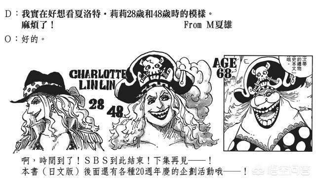 在单行本的86卷SBS中娜美,尾田就曾公开过大妈老去的模样,看完很是感慨!虽然谈不上多惊艳吧,但28岁的大妈也带有点欧美范,看起来也挺美,也难怪他年轻时那么多丈夫(据布琳保守估计,丈夫就多达43位),这跟她的美貌也是有一定关系的!但到48岁以后就严重走样,到68岁就更没法看了!不过大妈那么嗜吃,变胖变丑,倒也是意料之中的事!