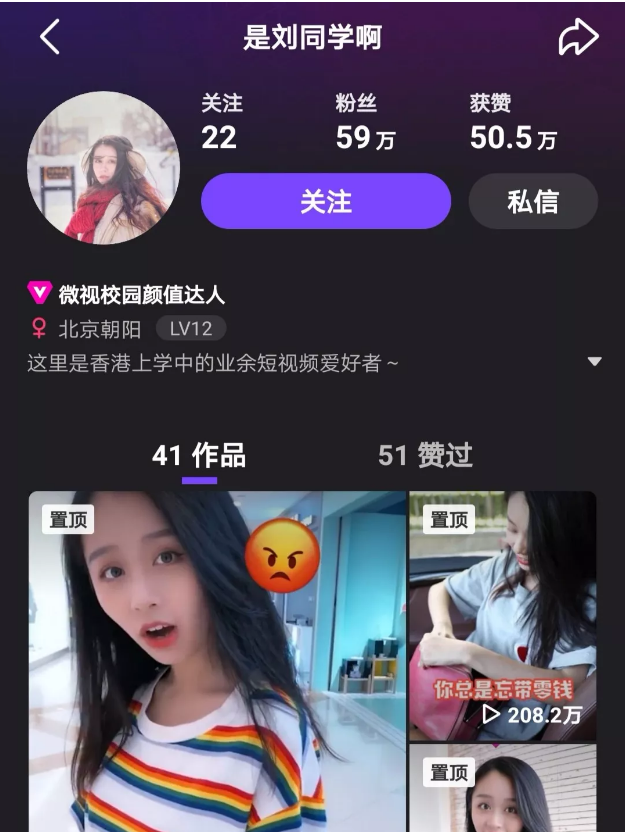 5月,刘同窗看到一条腾讯微视达人实习生的招募文章。由于对在镜头前展示本人抱有激烈的盼望,犹疑再三后她还是投了简历,侥幸的是,微视很快就联络到她,于是就有了“是刘同窗啊”这个账号。