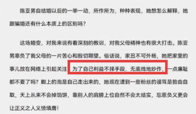 再来看看被大衣哥否定的“朱单伟声明”,在这个假的声明中,很多信息也都是可探讨的陈亚男。比如,有提到陈亚男骗婚,想要炒作之类的,以及为达目的不择手段,有阴谋等等。