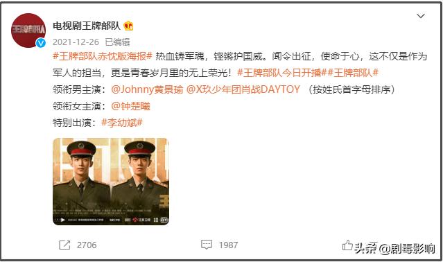 直到12月26日开播首日的官宣上,也特意注明,演员表都是按照姓氏首字母排序,领衔男演员处先后@了黄景瑜和肖战王牌部队。