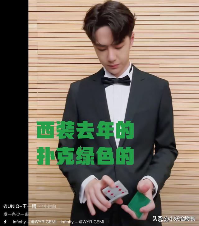 估计老是被大众说敷衍,王一博这次从众多库存备货中,扒拉了半天,发了一个魔·术扑克牌的视频,看起来相当有排面王一博。